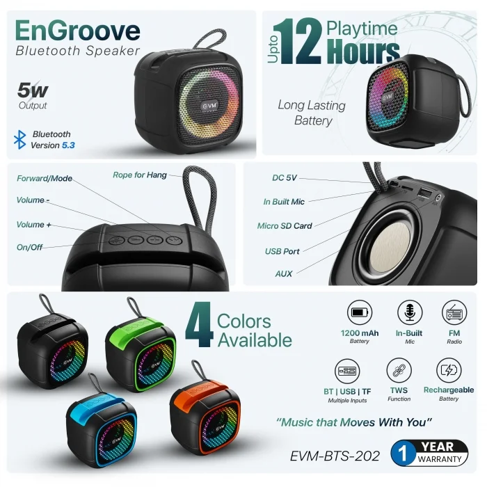 Unleash powerful sound with the EVM EnGroove Bluetooth Speaker! Designed for both crystal clear audio and long-lasting performance, this wireless speaker delivers 5-watt output with punchy sound and immersive RGB lights for any setting.