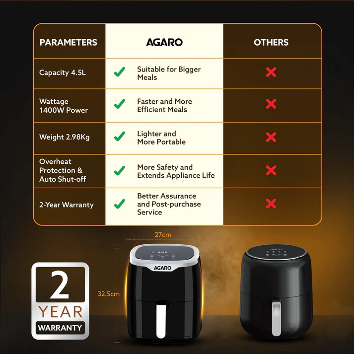 Additional perks include overheat protection and an auto shut-off feature, ensuring safety during cooking, plus included accessories like an inner tray and pan with handle. Backed by a 2-year warranty, this air fryer is a reliable, smart addition to your kitchen arsenal.