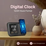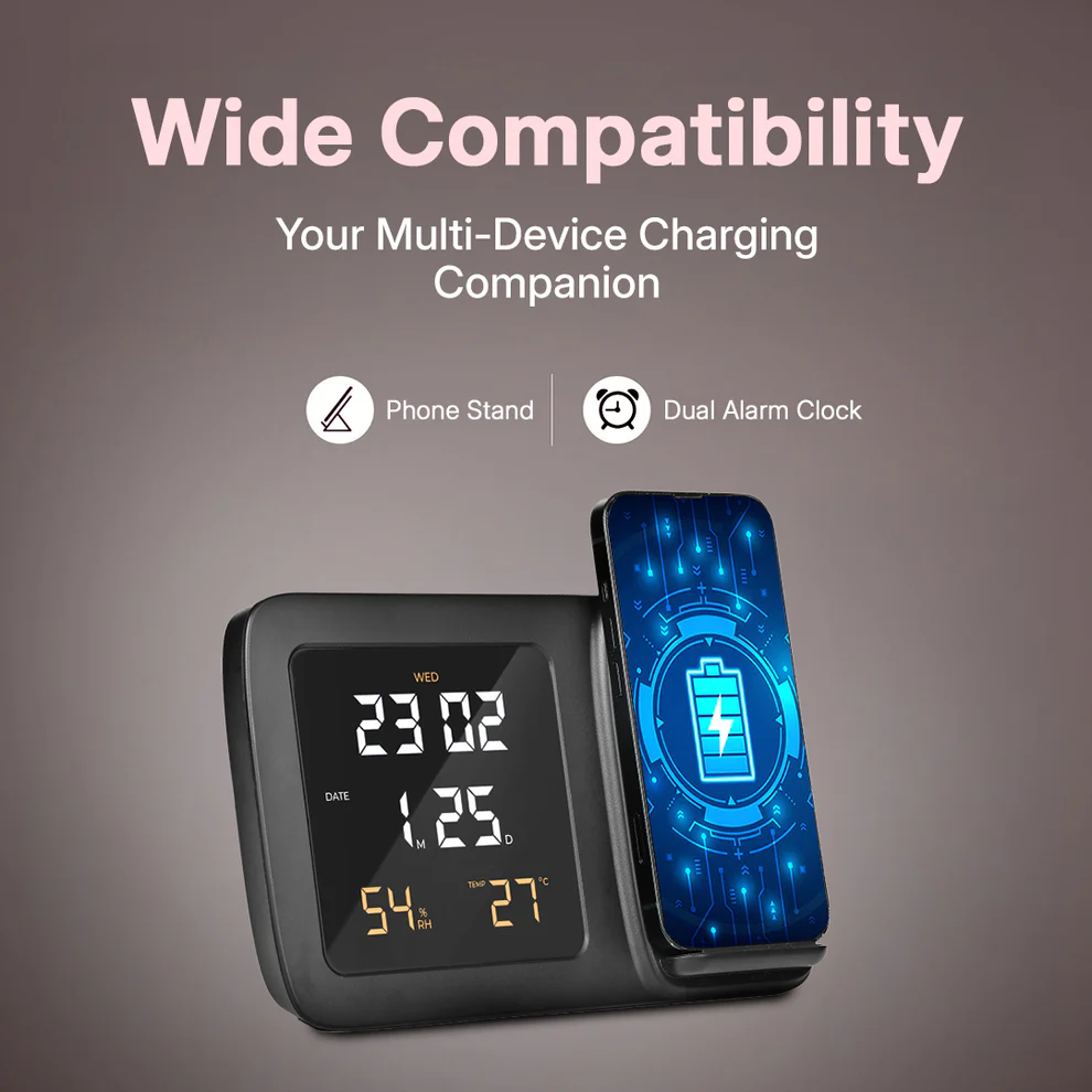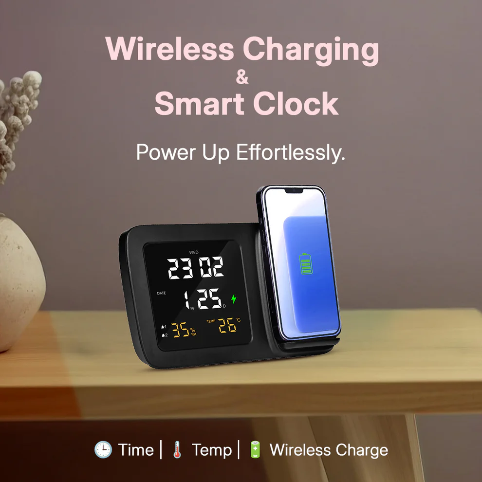 Real Use Example: Place your phone to charge as you prep for work, wake to dual alarms, check your room’s temperature at a glance, and enjoy a neat, cord-free desk. No more frantic fumbling for charging cables or missed alarms on busy mornings!