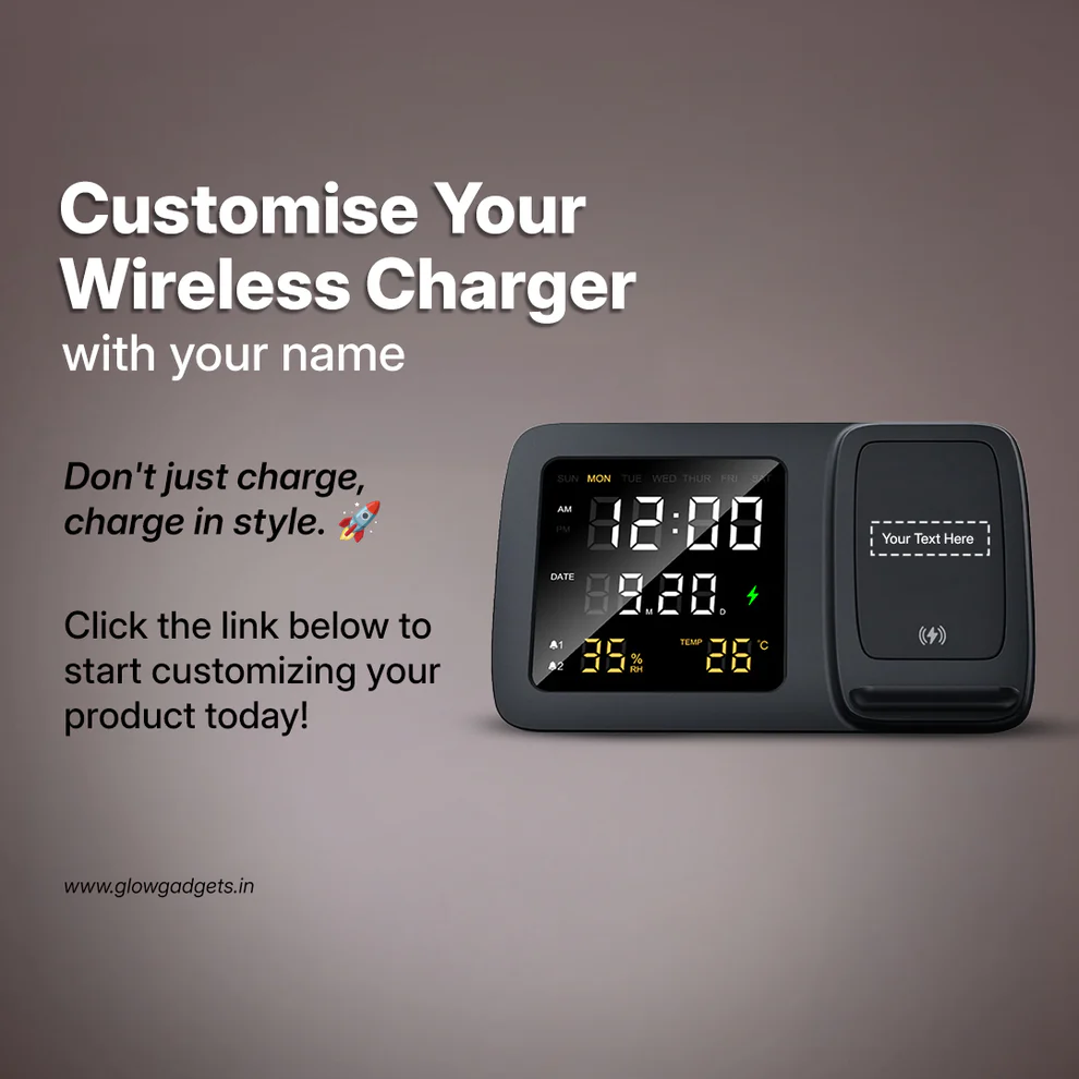 Shimmer Wireless Charger with Smart Clock is your must-have tech upgrade for any desk or bedside. With sleek black ABS styling and a vibrant light-up logo, this multifunctional accessory delivers so much more than just a charge.