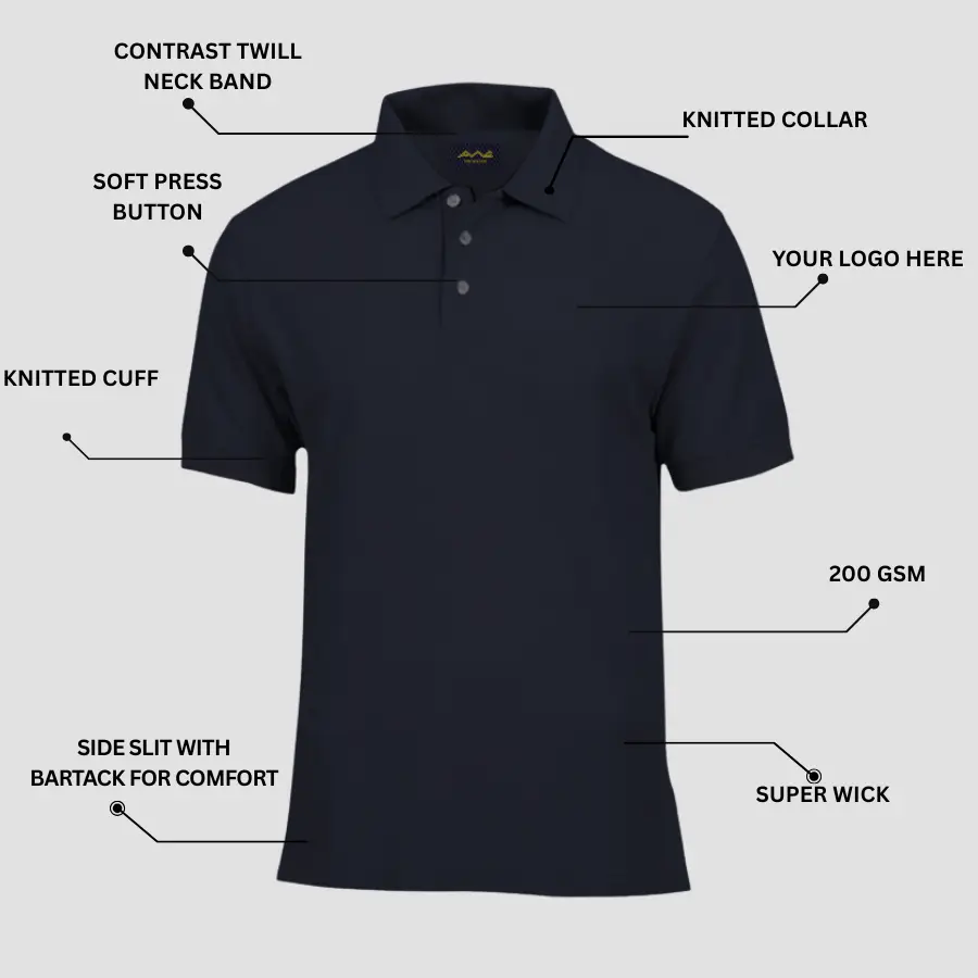 Navy Blue Polo T Shirt offers premium quality with unbeatable comfort. Made from 200 GSM micro polyester, this polo features advanced anti-microbial and UV protection technologies that keep you fresh and protected all day. Its ultra-soft, lightweight fabric is perfect for work, events, or casual wear. The classic navy blue color adds timeless sophistication to any outfit.