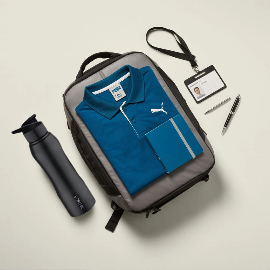 Includes pen, notebook, lanyard, laptop backpack & bottle
