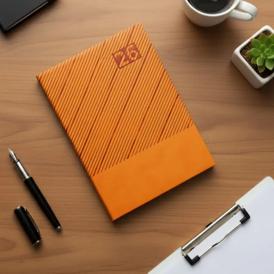Personalised business diaries – Premium quality A5 notebook with orange shade cover, white paper, two-color inner pages, and one day per page layout. Perfect for business professionals. Features 14 pages of basic information and 12 monthly planners. Code: BNB-KC-593. MOQ: 50 units.