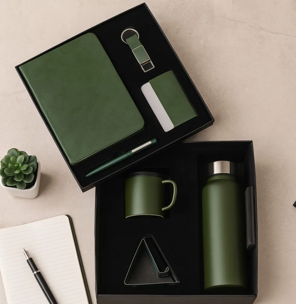 The Olive 7 in 1 Corporate Gift Set is your ultimate solution for professional gifting, featuring a notebook diary, pen, keychain, mobile stand, card holder, mug, and bottle—all designed to impress and enhance everyday productivity.